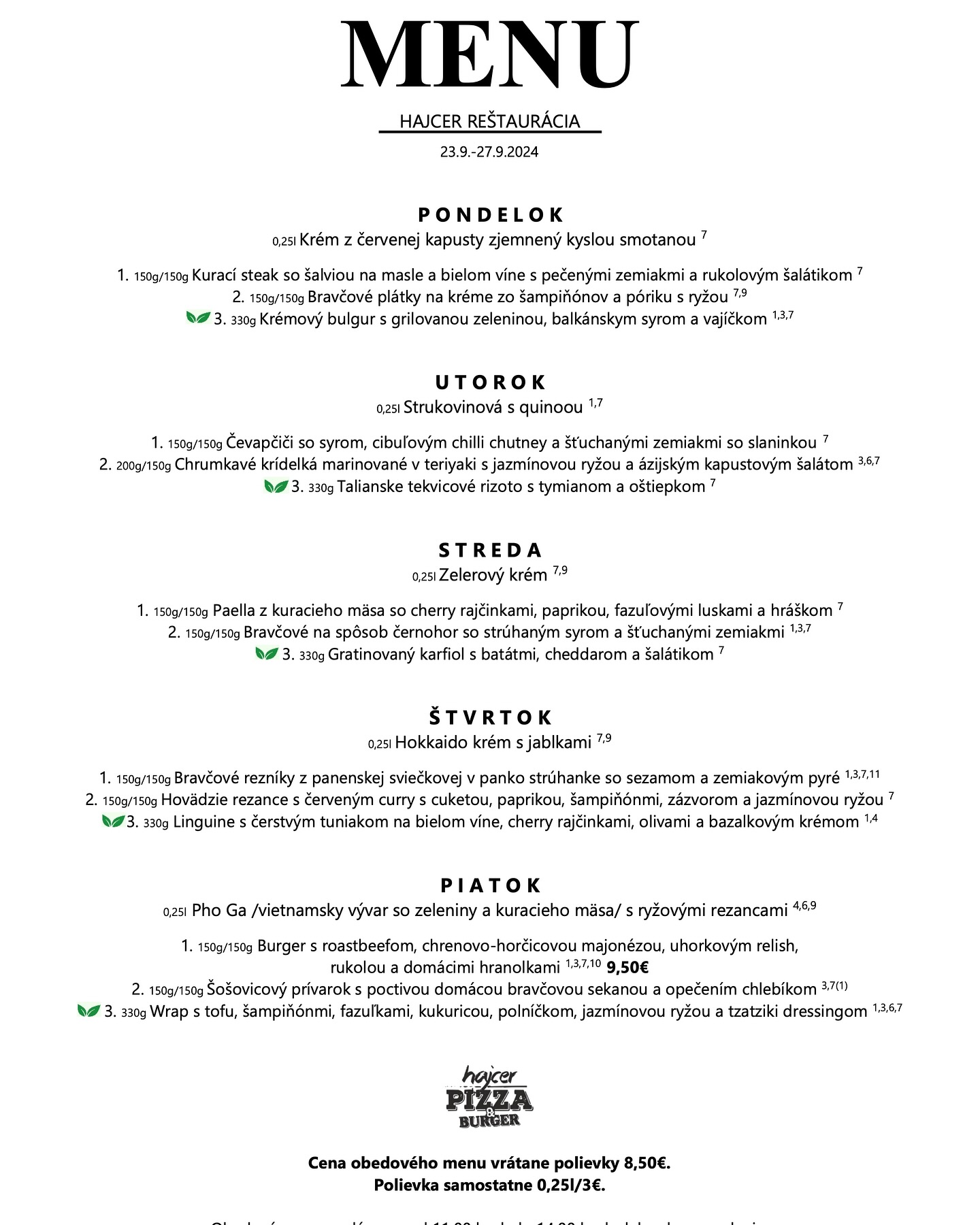 Denne menu platné od 23.09.2024 – 27.09.2024 Možnosť rozvozu Cena denného menu vrátane polievky je 8.50€. Platba kartou je možná.